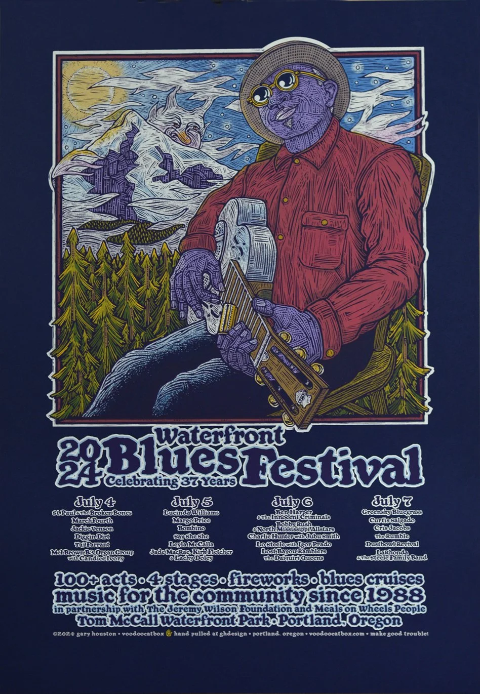 Gary Houston is a well-known artist based in Portland, Oregon, recognized for his work as the poster artist for the Portland Blues Festival since 2001. He operates under the moniker Voodoo Catbox, where he creates limited edition rock posters and original scratchboard art using traditional methods such as scratchboard illustration or hand-cut Rubylith.